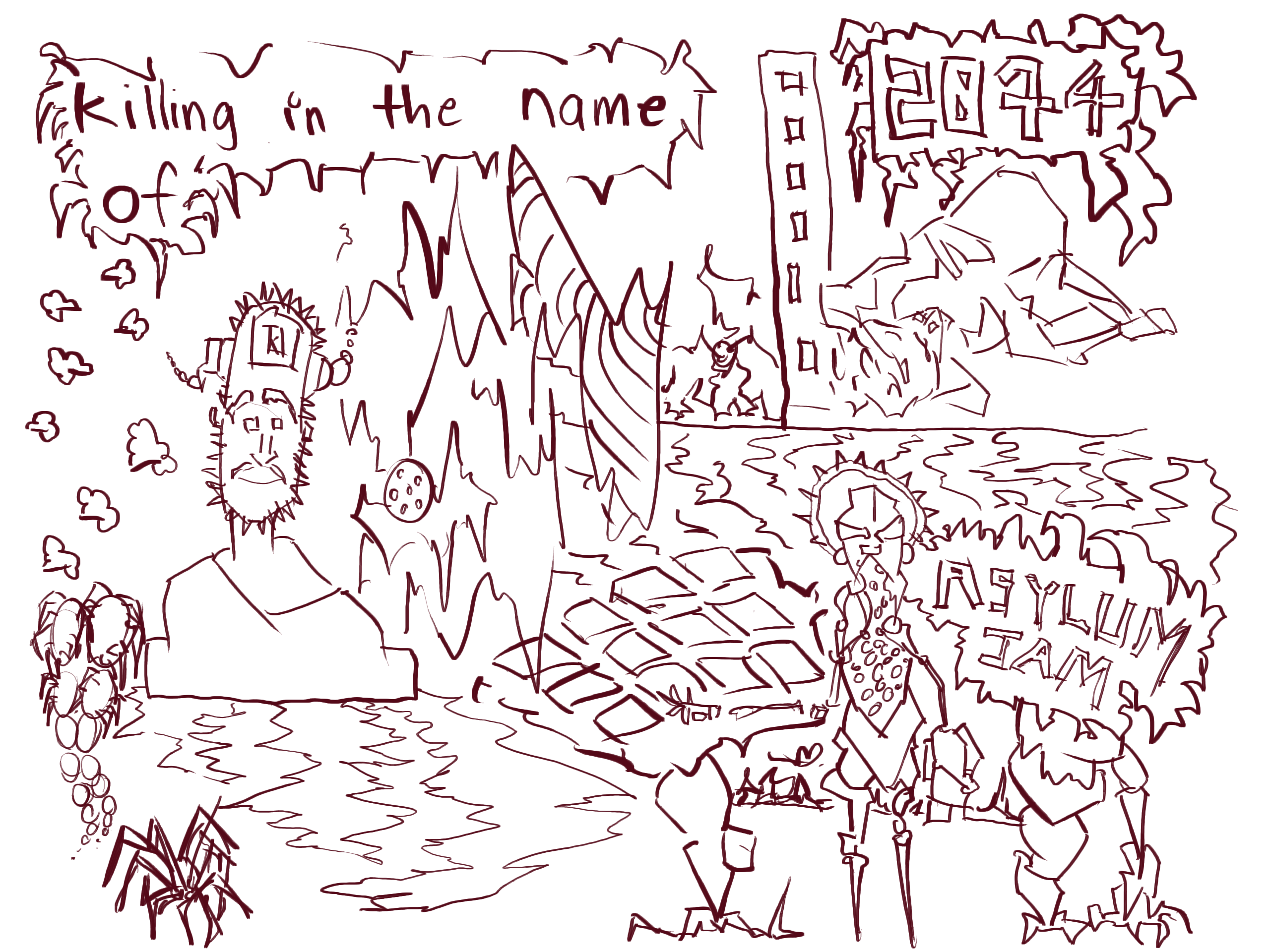 Started with the Spike InfoSec logo and character name. Drew the full figure character. Made it the usual robotic look, with spikes. I then redrew the character on the left in order to create a slightly different version (and larger!). This second character had spikes on it’s arm and an eye ball. The next one to draw was the claw (third on the left). Finally the dino/monster creation on the far right. Clouds were added and a little water.