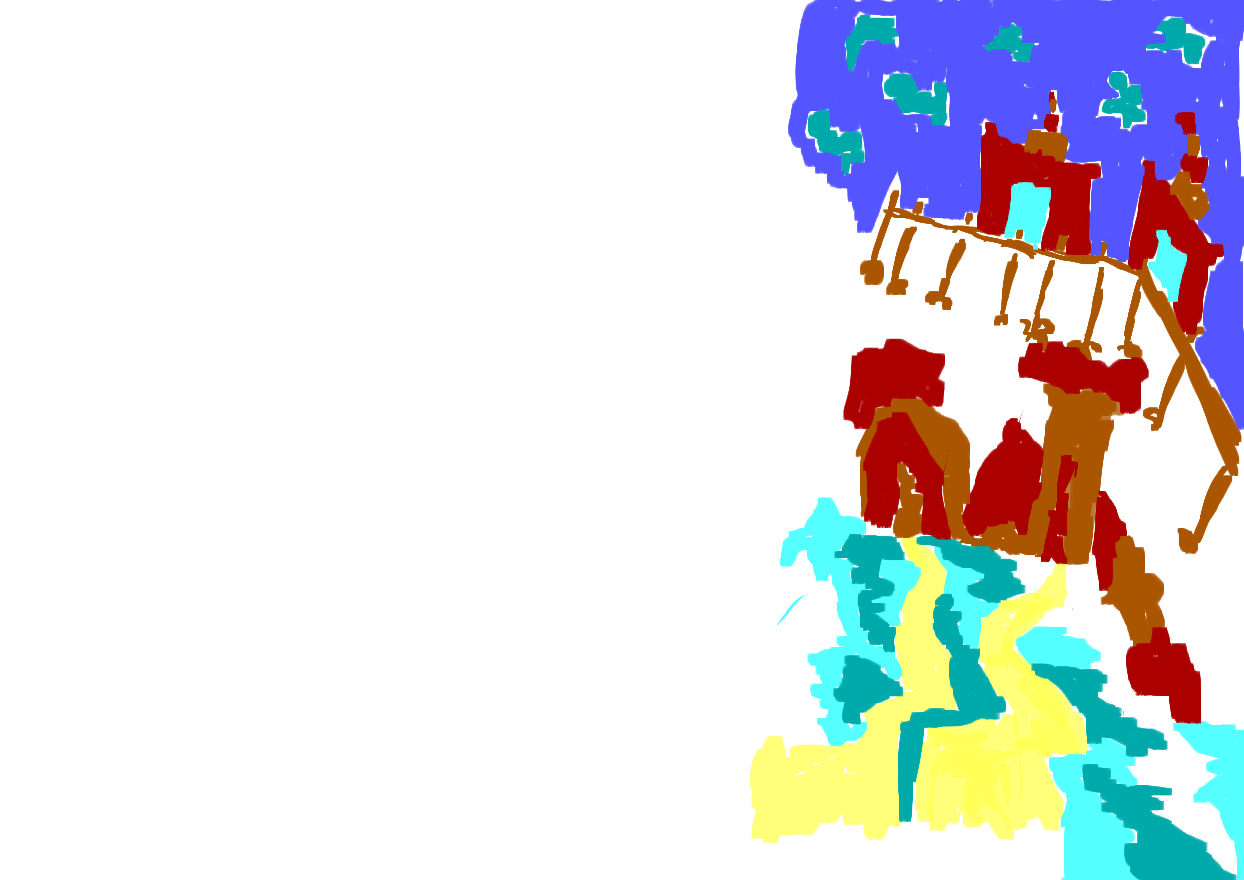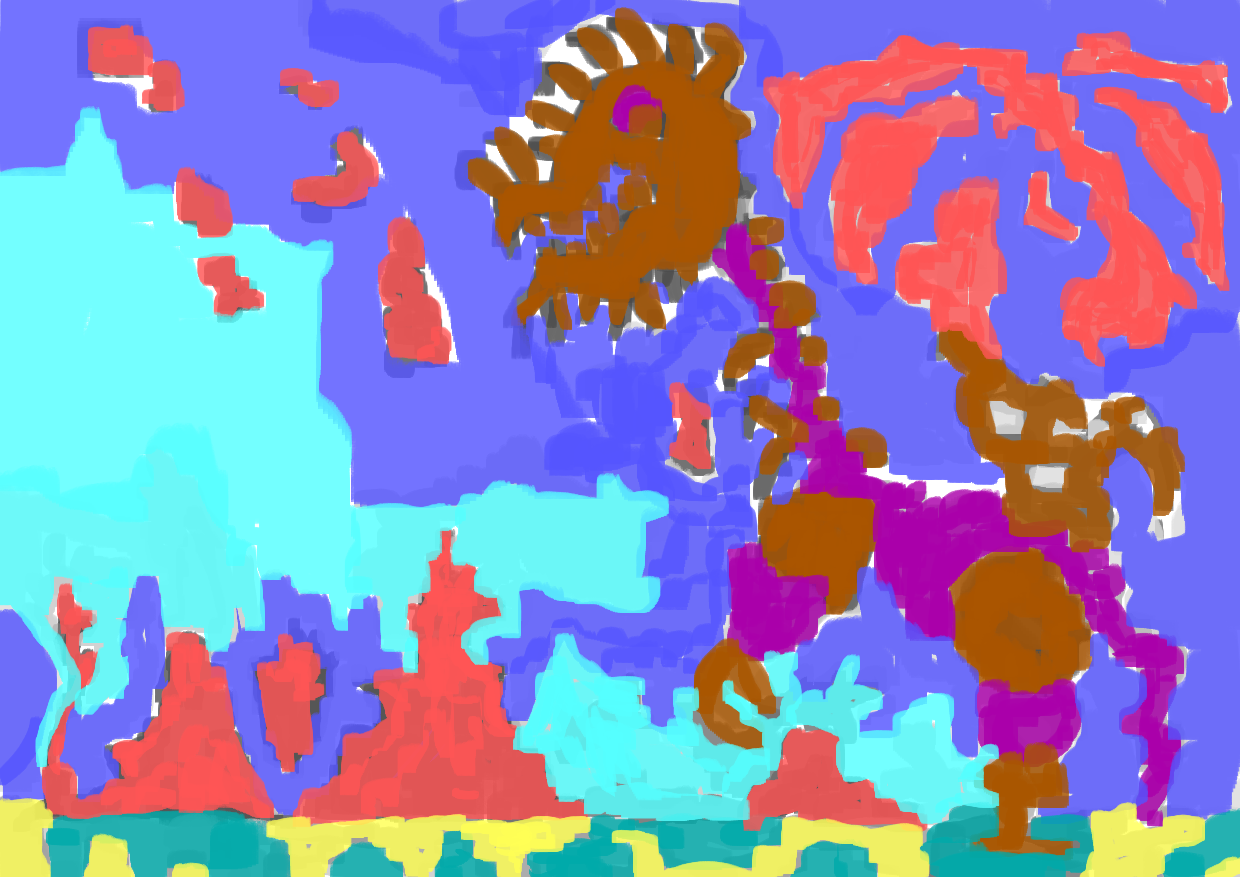Colour layer added. I am happy with the red and brown, they mi together well and remind me of my usual colours. The magenta is new for me, it’s certainly much lighter and bright then the usual colours I would use. Cyan for the cloud. Blue for background (but it’s too dark, I miss my light blue!)