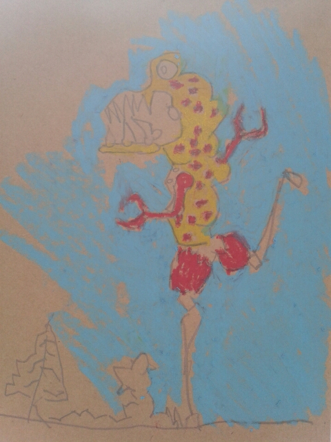 Monster on brown paper. Started with pencil line, drawing the monster and line for horizon line. Trees and land added to this. The monster has a trex like head, with sharp long teeth. Instead of hands the trex has two claws. The colour was added with oil pastel. Yellow for the skin, red for dots, arms, legs. Blue was used for the background.