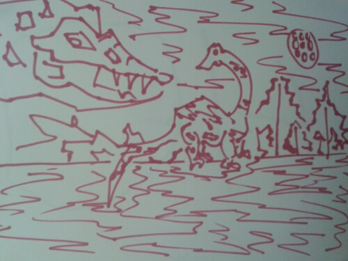 Dino drawing I worked on. In the background I drew trees and land. water comes into the foreground.