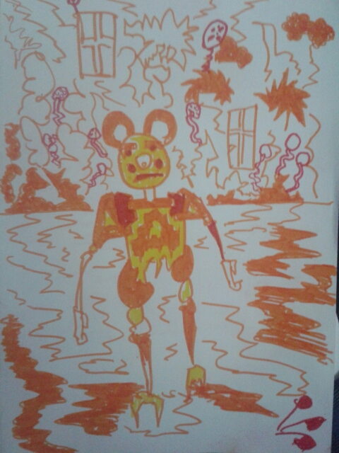 I drew this at a friends place with a six year old. He drew Micky Mouse and then I redrew the Micky Mouse - you can see this in the ears. In the background I added a landscape to the background. Windows are floating in the sky, along with ballons. Water comes to the foreground. The ballons in the bottom right are drawn by him.