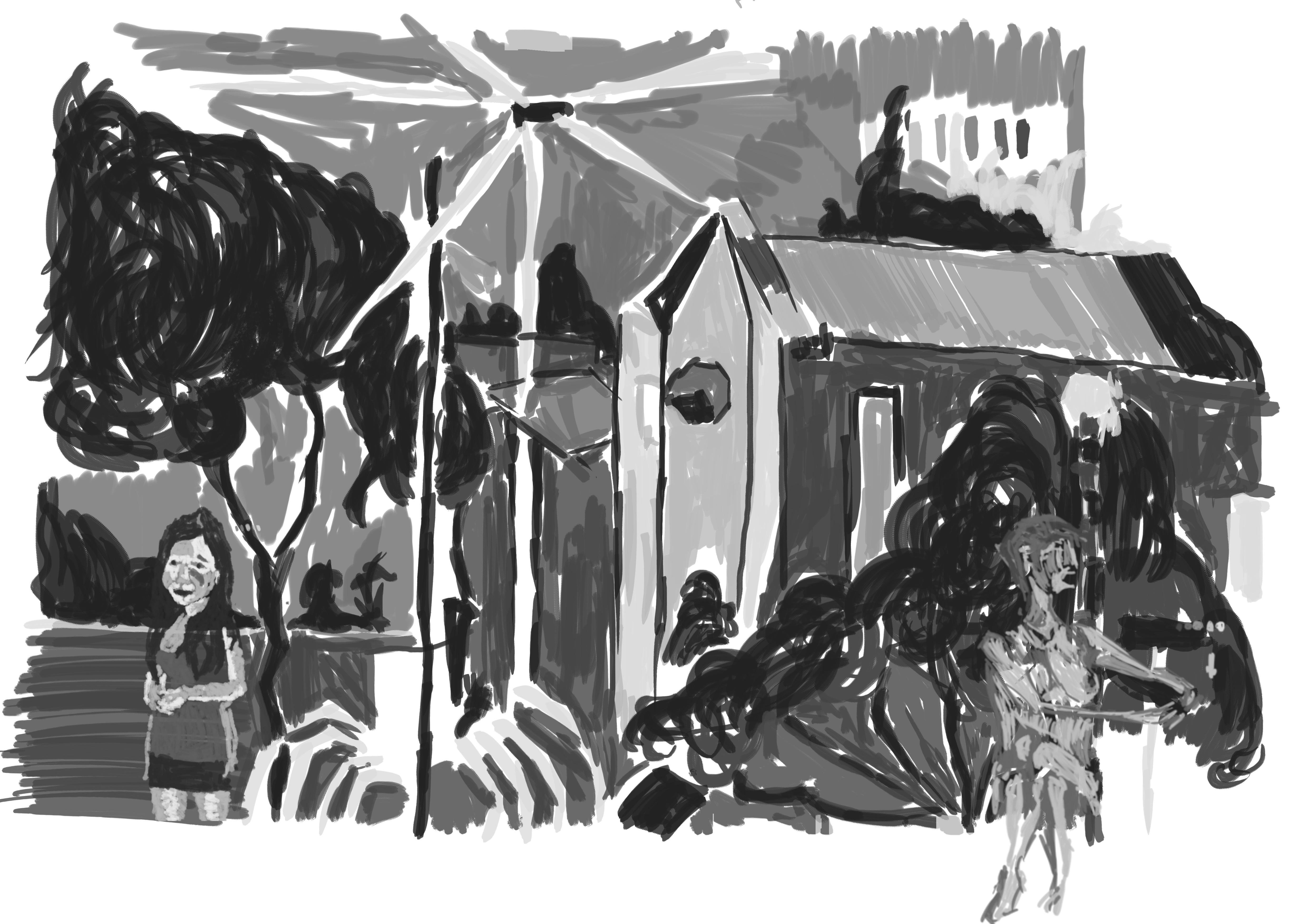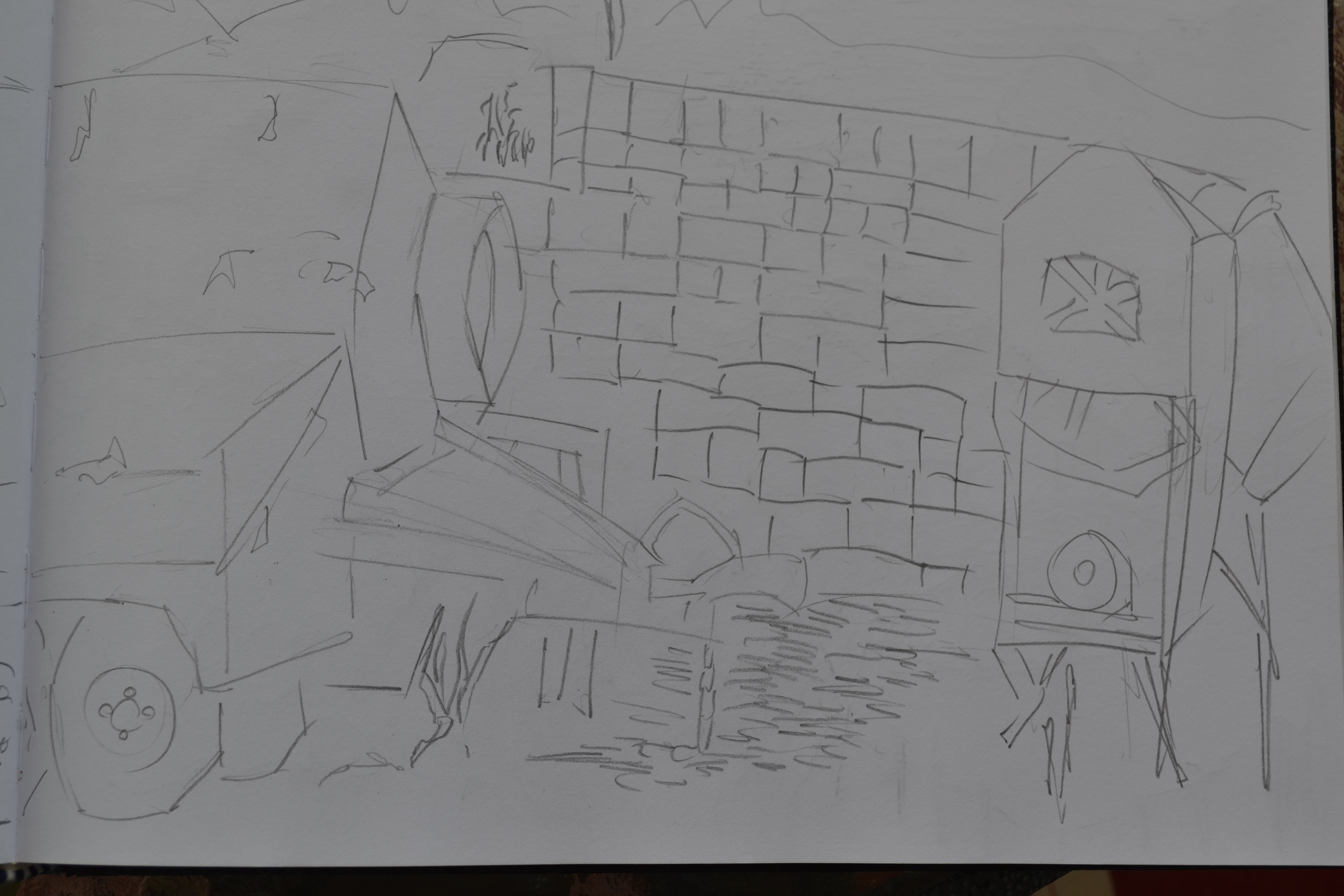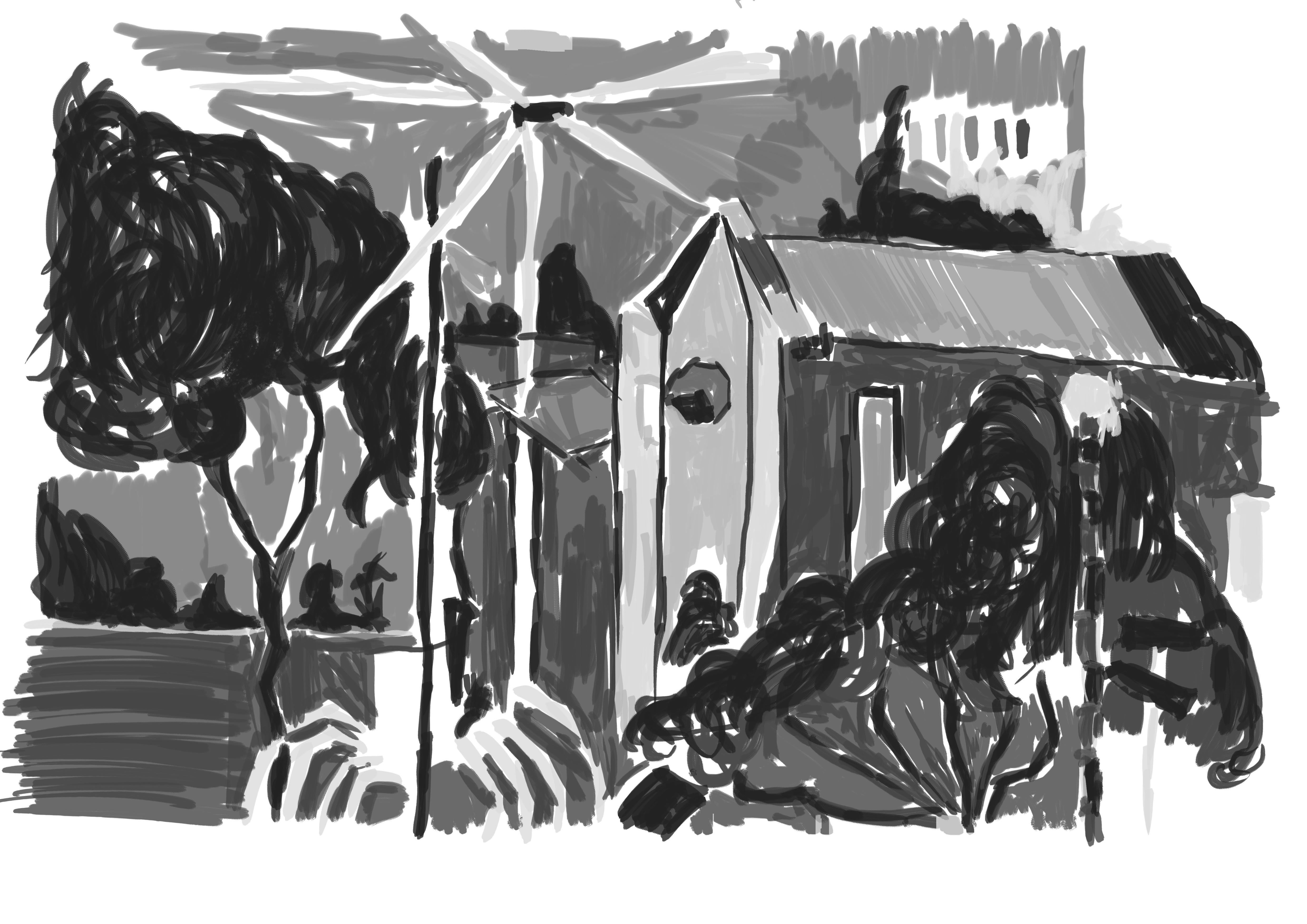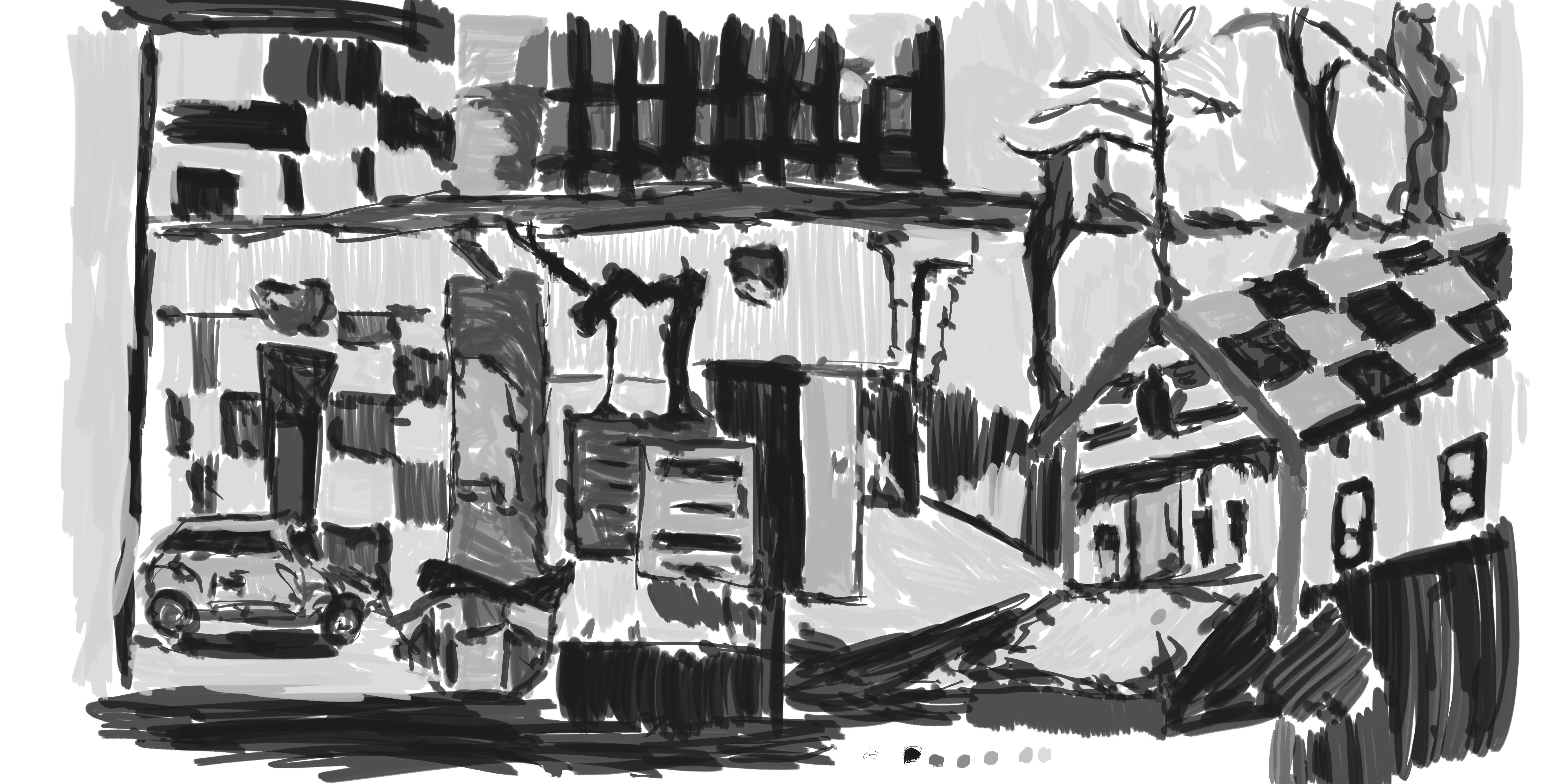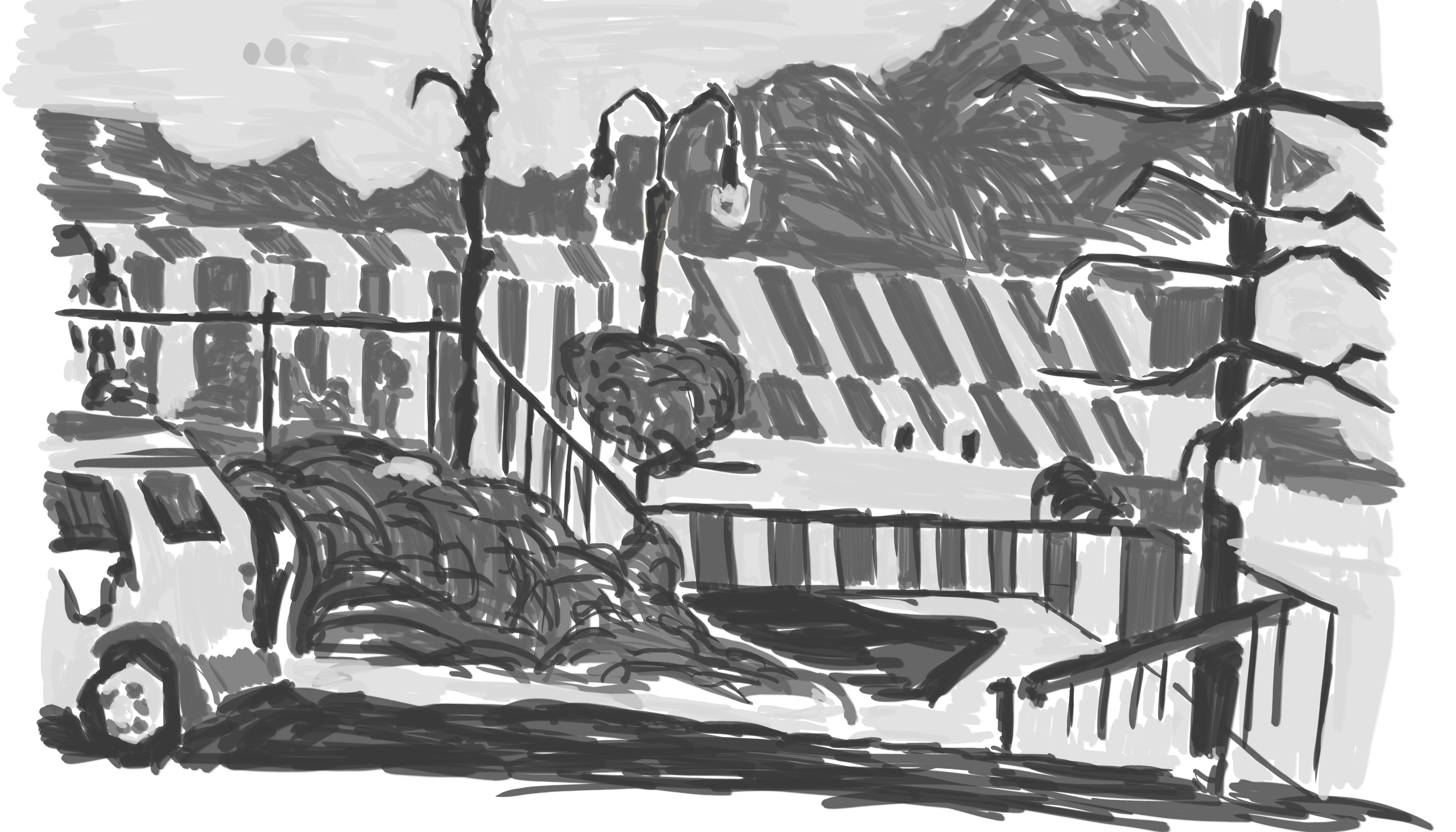 The reference for this was a drawing I did during my time in Napier visiting my Grandfather. It was one of my more successful drawings during the time. As you can see I didn’t make the same mistake as the previous work and it’s on a new layer. The detail is somewhat lower than some of the previous environmental works I have done. I had considered adding the right page drawing onto it - at one point I began scaling this image down in order to make room. I decided against it in the end, though I could mix other line drawings into this in the future and repaint.