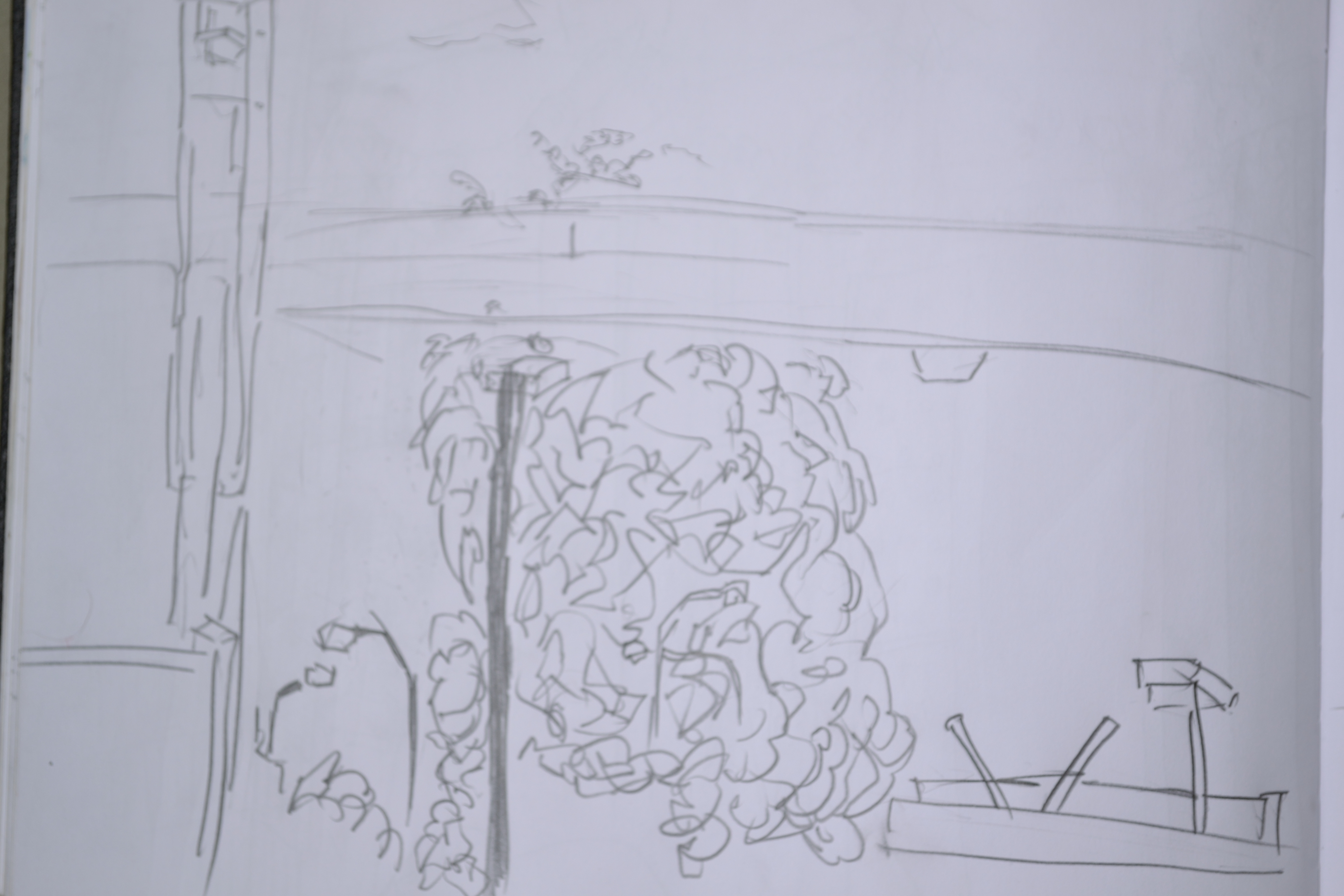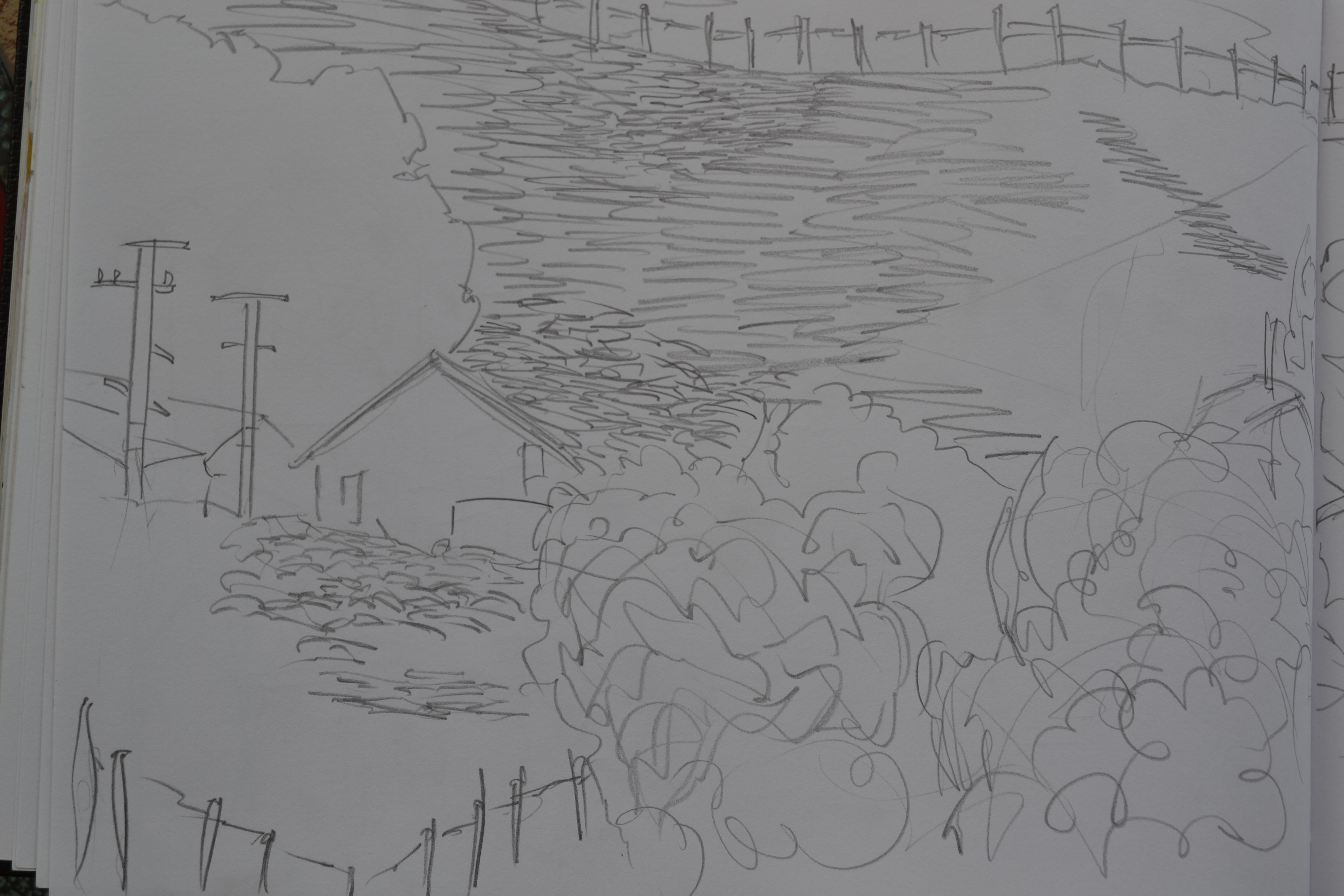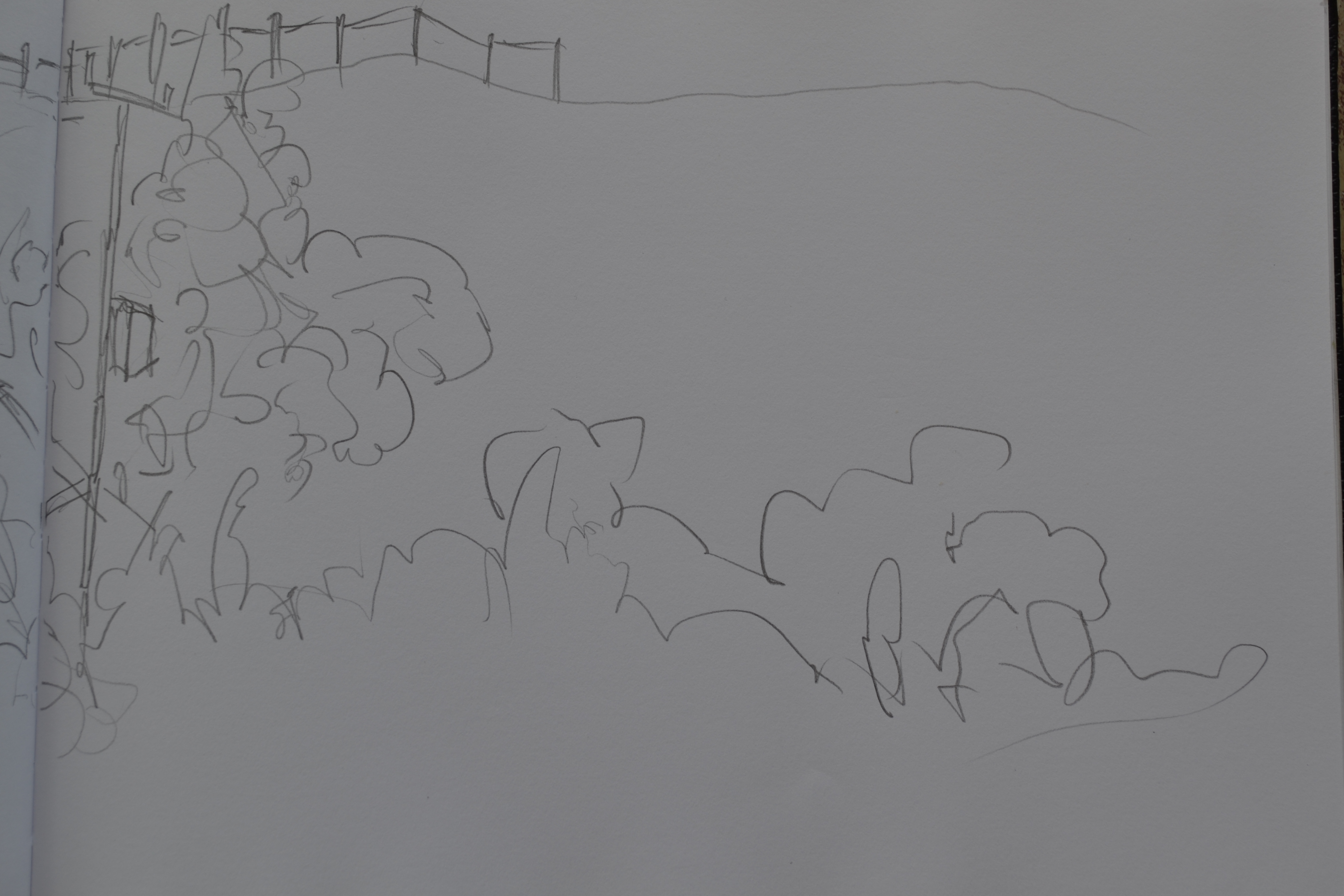 Right side of the previous drawing. Not as much happening here, I guess I lost interest and went inside to the computer. The very left is a power pole, followed by vegetation At the top the fence continues along The hill twists and turns.