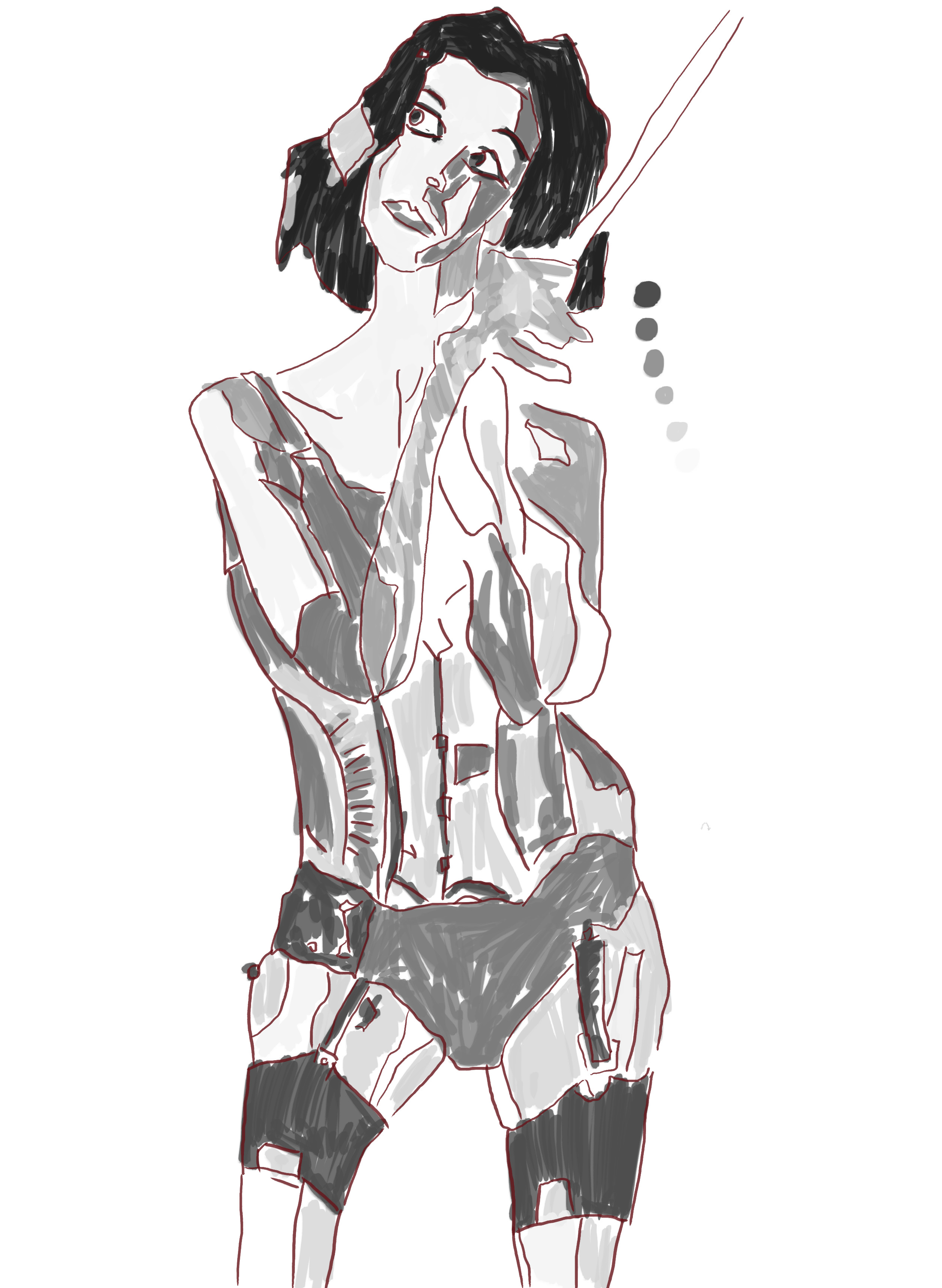 The line was created on the same layer as the drawing sadly. Normally I’m good at creating a new layer first - but this time I messed up. It’s alright. I normally don’t use the line for much but rather develop the painted layer further. I decided to draw the light and dark separates inside the figure rather than just tracing around. This makes it easier for the next stage….