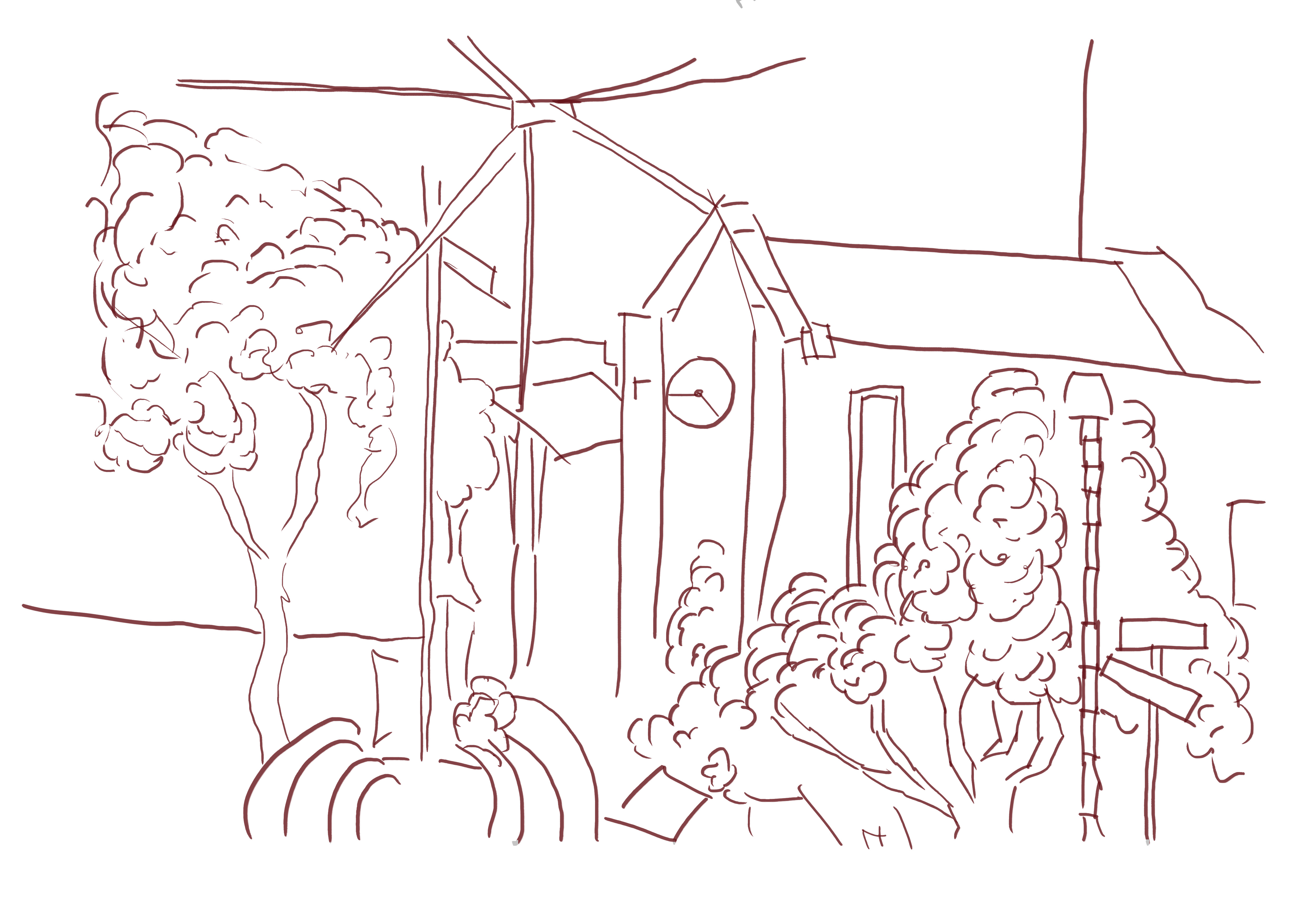 The reference I used for this is a pencil sketch drawn in Levin - at the skate park. I’ll be back in Levin tomorrow so will try to get out and draw the town again. Despite being such a small town I always enjoyed getting outside and drawing. Normally I don’t add so much line to the vegetation - but I did on this. Maybe I should have a go at using different colors for the line version? Getting layer masks working would help with this.