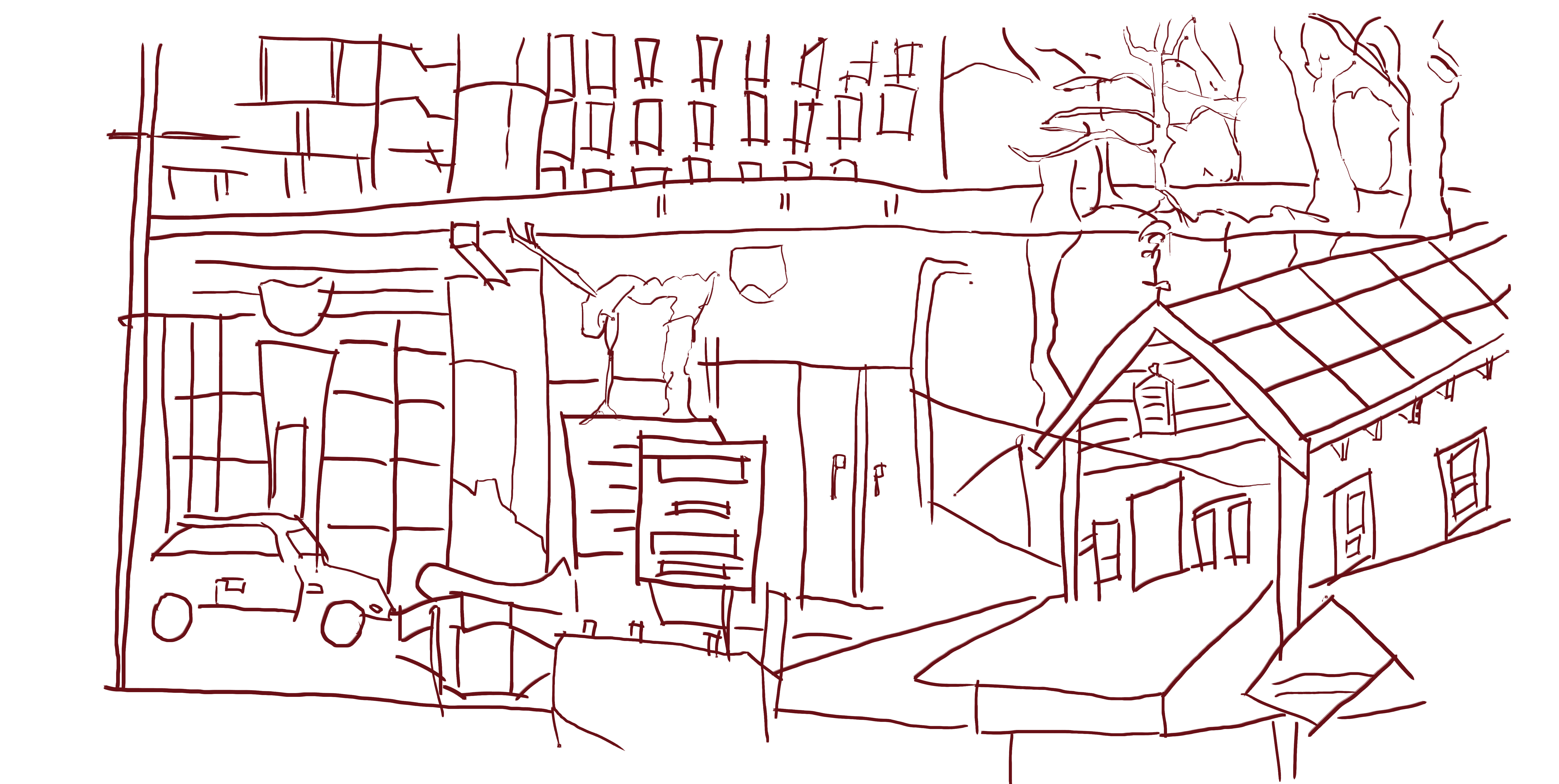 Another drawing of Poringa. I started with drawing part of the neighbors house and drew vegetation fences and the hill behind it. A fence ran all the way across the top of the fence.
