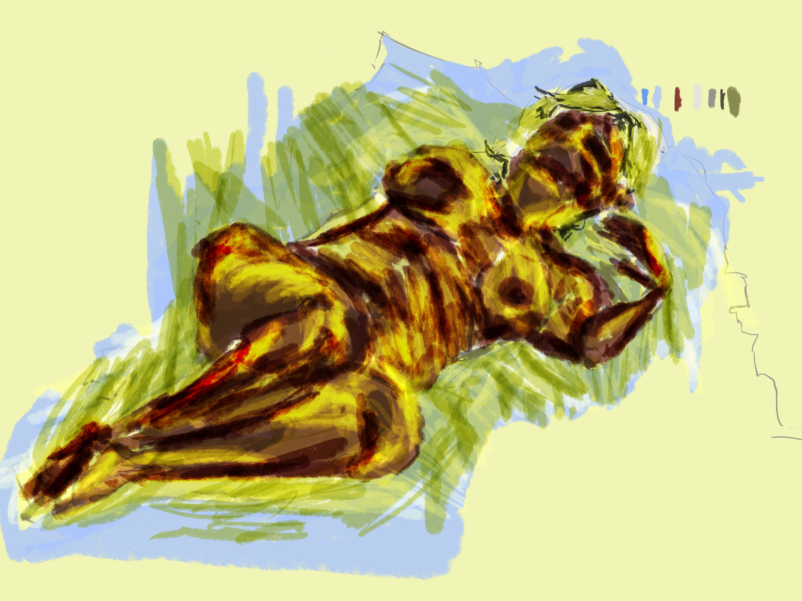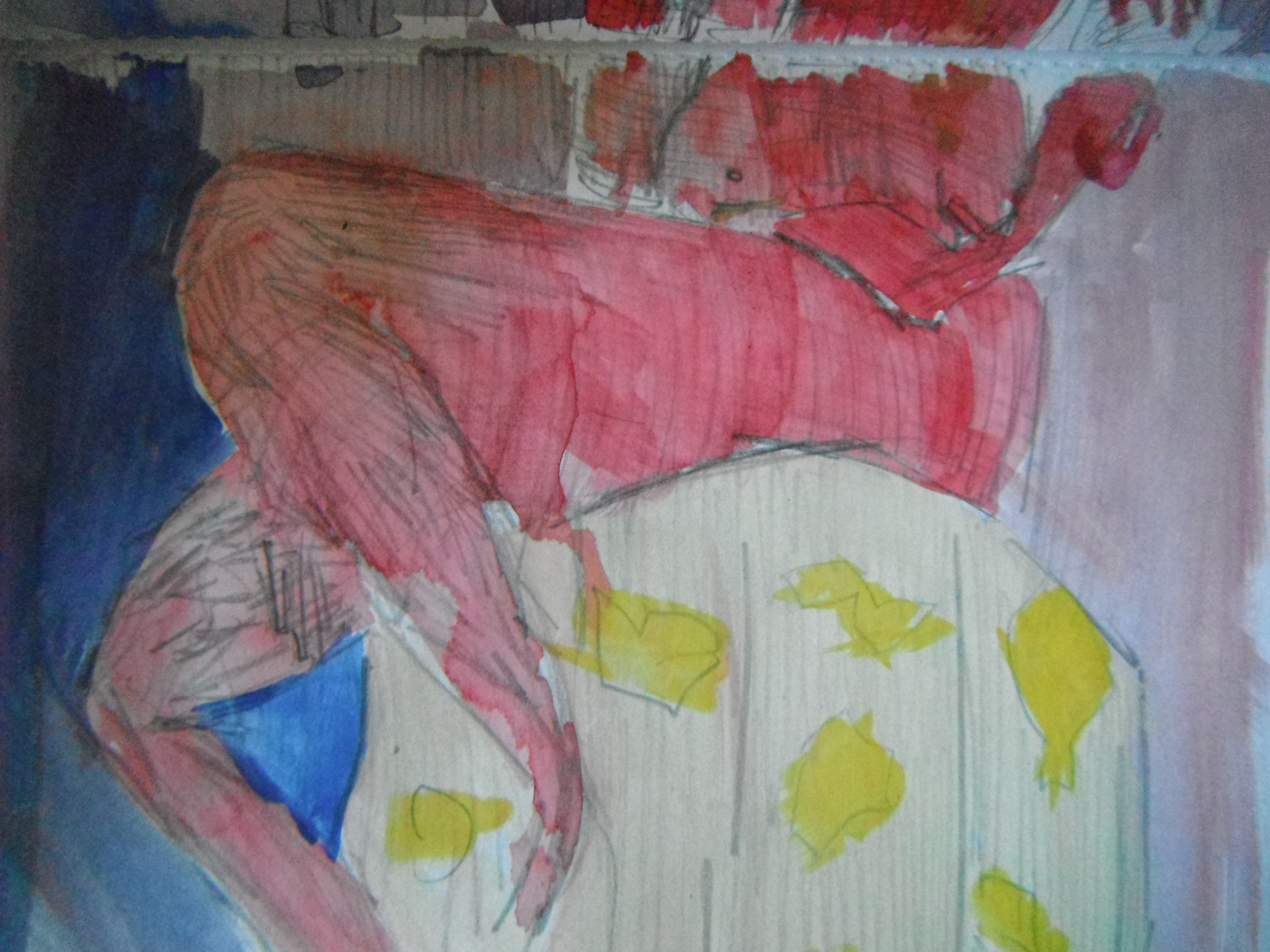 Color added. I started with the yellows - light and dark. Afterwards I added a red. Roger noticed the red and said it helped the work. This piece reminds me of the acrylic life painting I use to do in Dans Friday drawing class. It’s got that expressionism feel to it - mixing the tonal and line together. A range of colors helps.