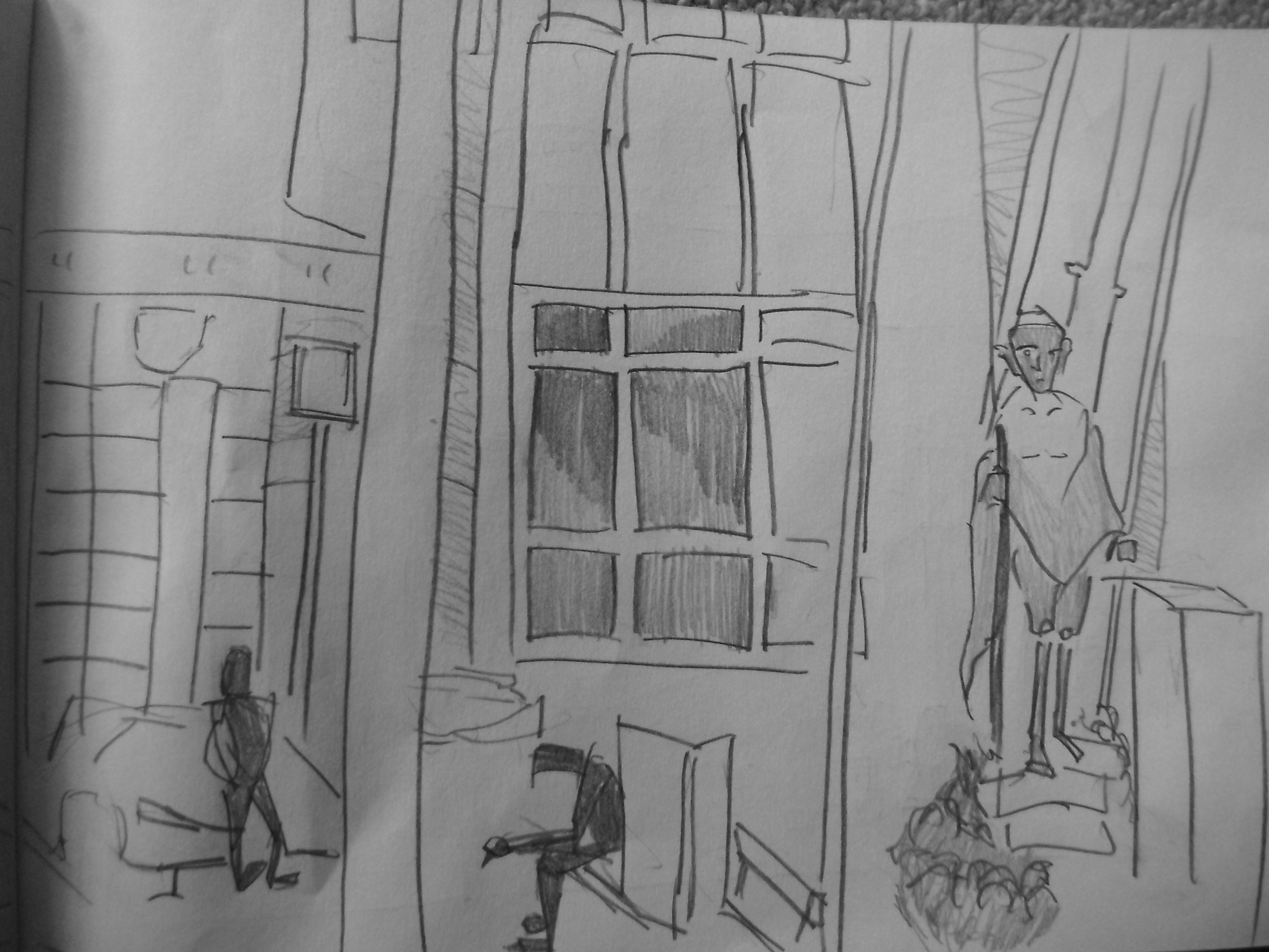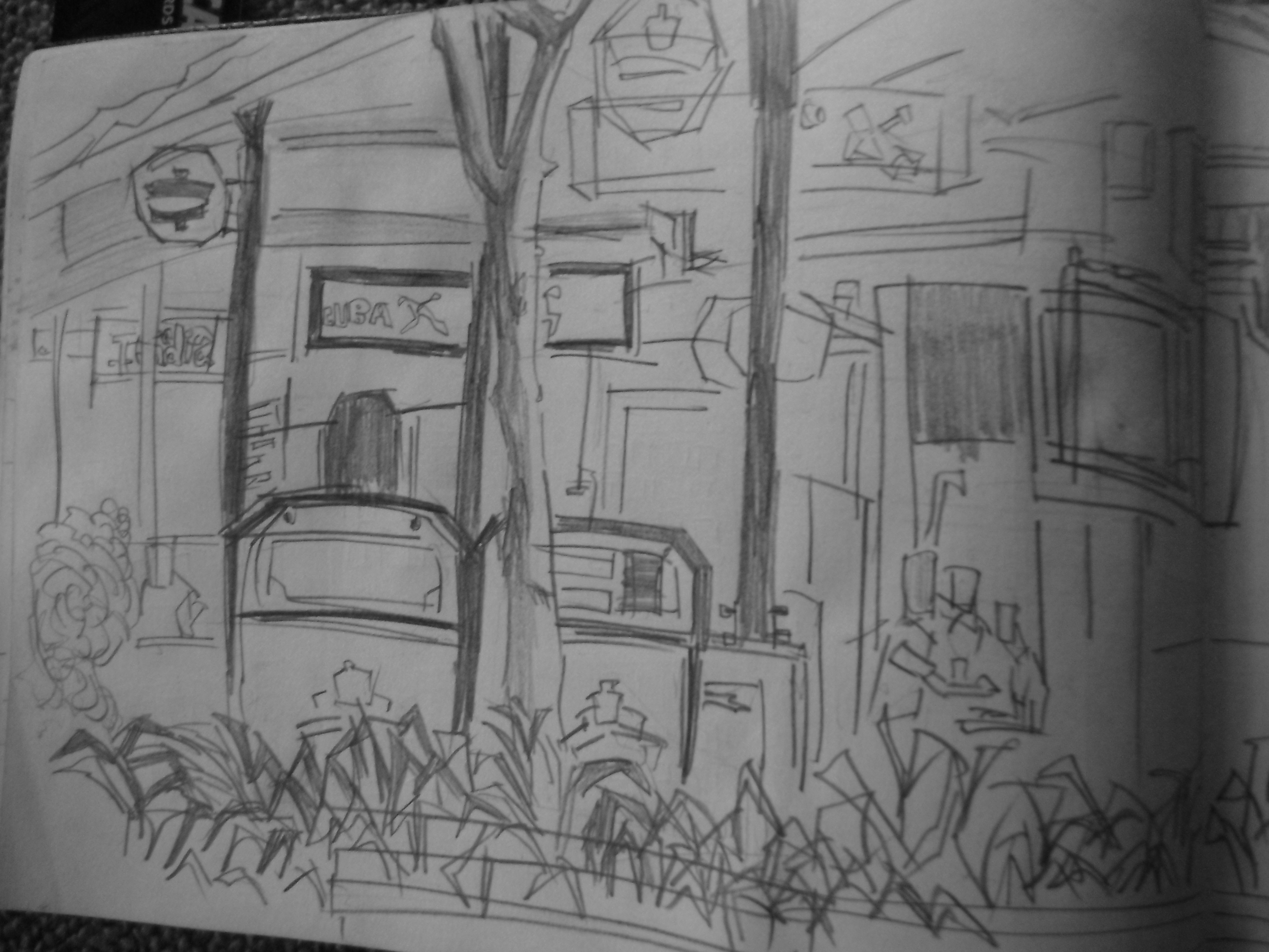 Second page. This is one of the most complete drawings I’ve done. I partially enjoyed drawing the animal outside the bookstore. It gave the scene - ‘oh yeah, I know where that is’.