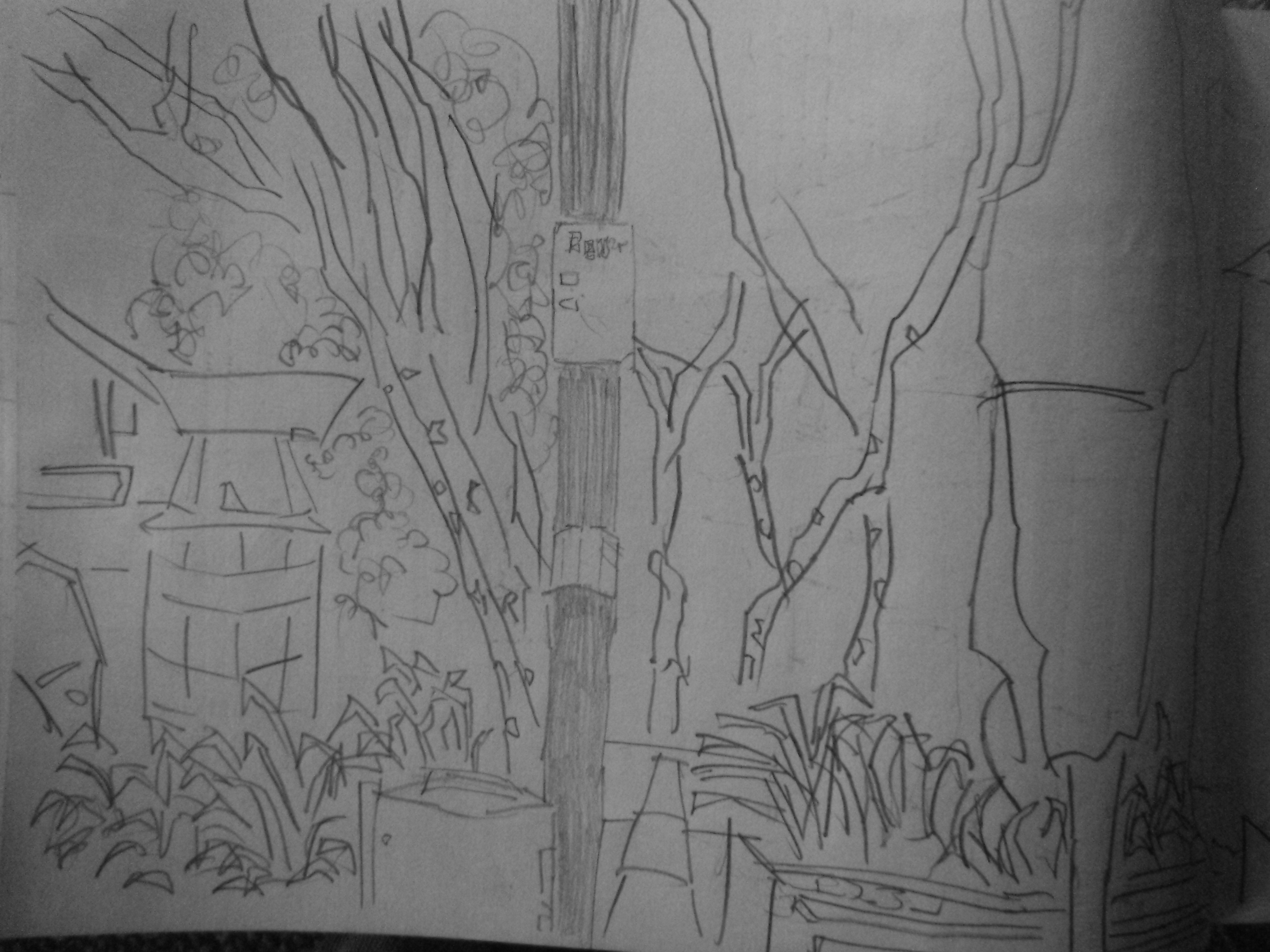 Just went to New World for lunch. Found a seat nearby to draw. Spent the majority of the time working on the lights and shelter behind. There was a large building the the background. Tone added to areas - the signs and the sky.