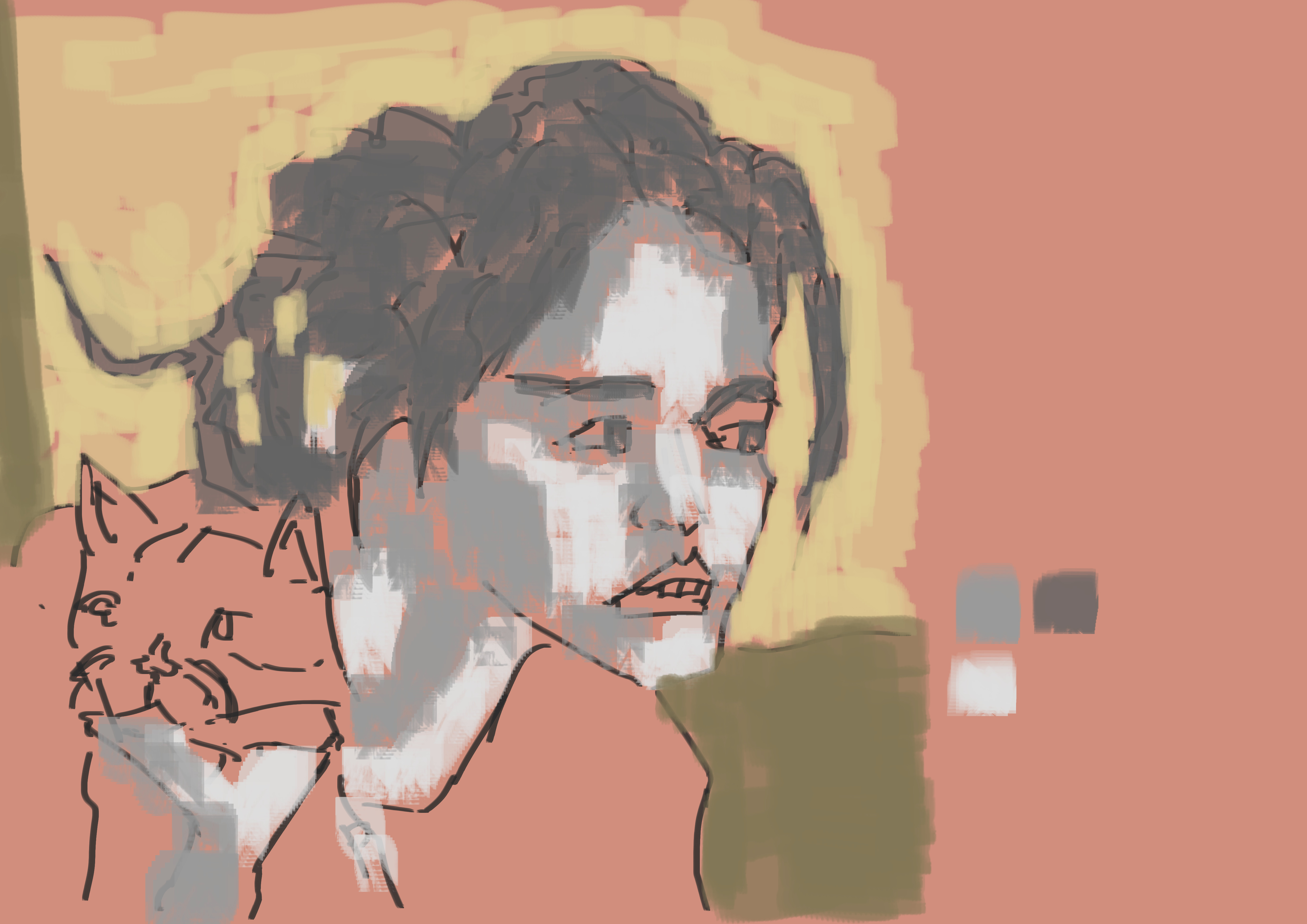 The cat was expecially nice to draw. More people need to upload portraits with their cats. I like this portrait. She looks similar to an old friend - Sky. With all these portraits I started with the line - then grayscale tone, then finally color. It’s a process that works for me. Sadly I didn’t preserve the line or grayscale layers - something I’ve been doing regularly with the digital street works. I think it’s importrant to keep these underlayers because it may be helpful to go back to the line work and re do the tone and color in future. Who knows what will happen with them?