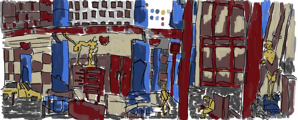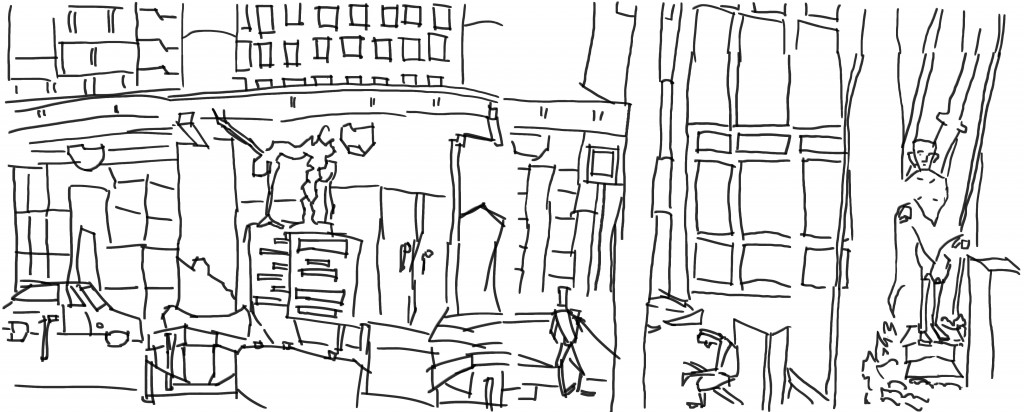 Cuba Street. Sitting on a bench looking toward the shops on the right. Capturing all the information that I can see. Managed to capture some figures. I don’t spent long on the figures but just use them to give a sense of scale to the work.