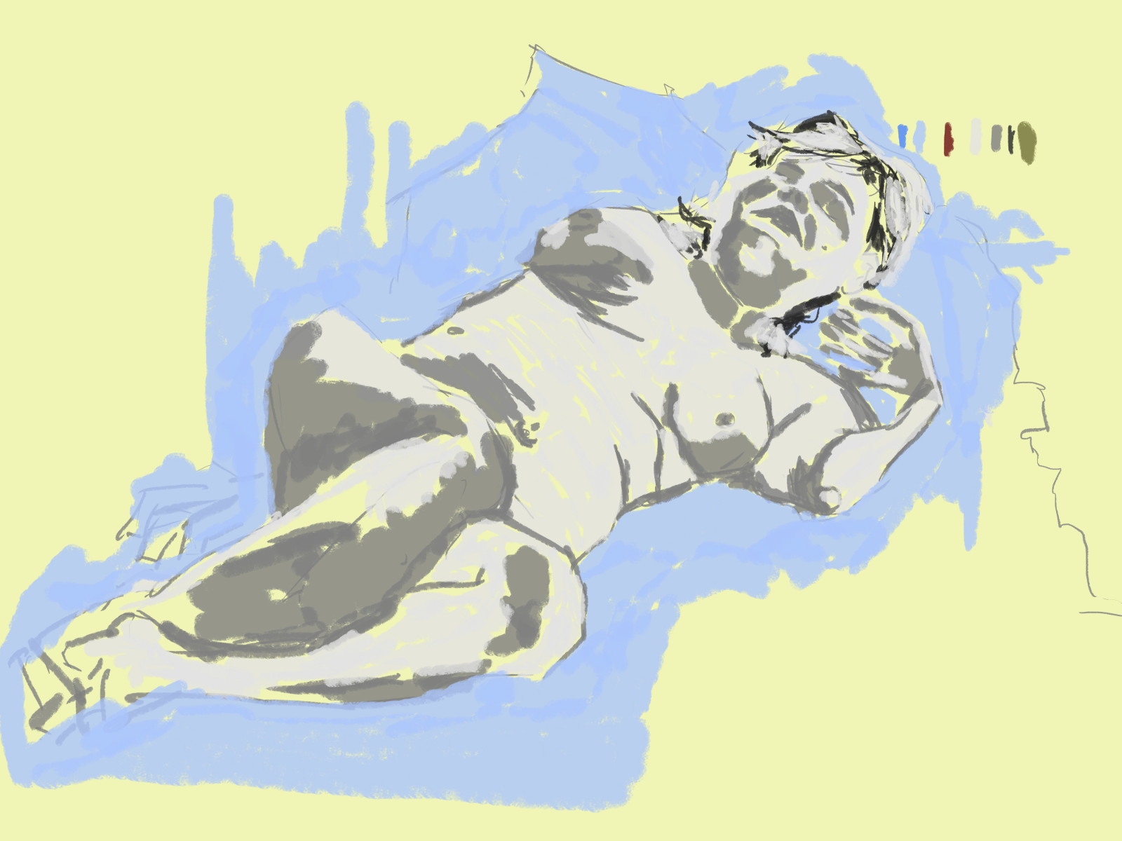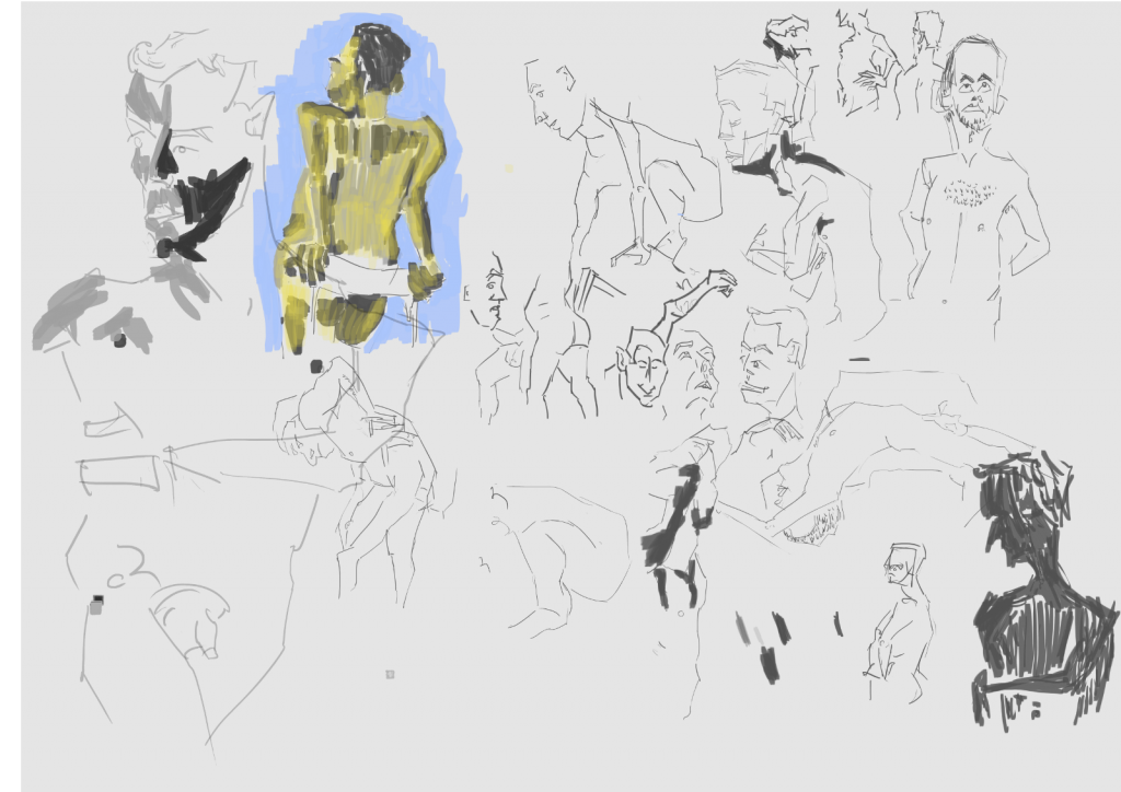 Works for the whole day. The poses were extremely quick so I didn’t have time to capture tone or full figures. Instead I just focused on capturing areas of the body - like I use to. There was one longer pose (top left) that I was able to add tone and color too. In Rogers I extended this idea further.