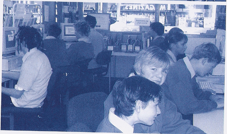 Second page. Clouds in the sky. Poles scaling up to show the distance. Some vegetation scatted in areas. New World building on the right. Cars on the bottom left - very rough.